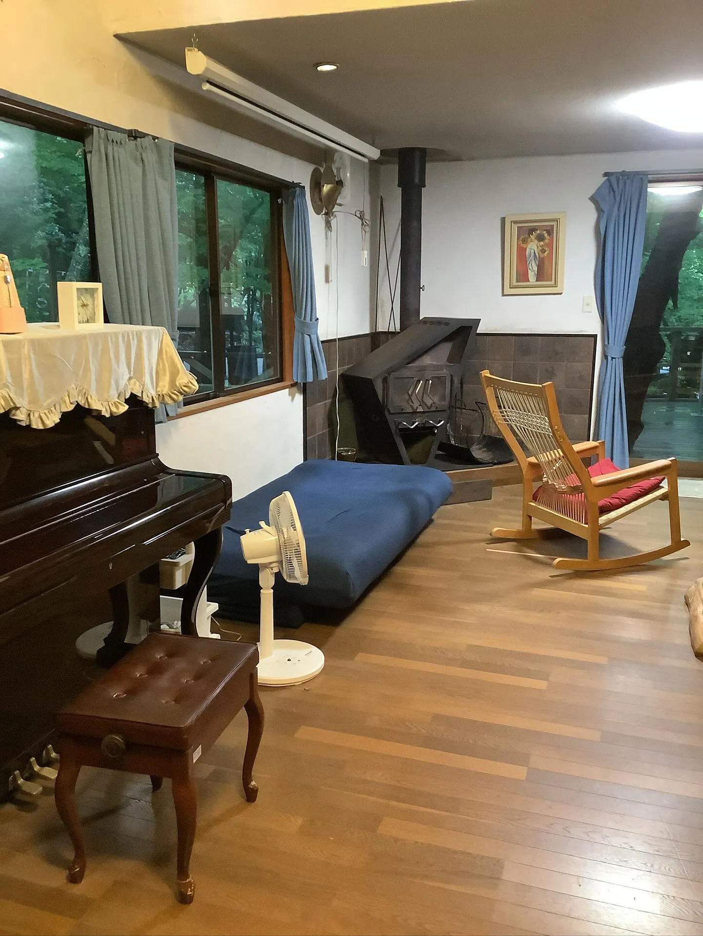 本館高千穂内に置いてあるピアノとリビングです、そして別館新燃内のピアノそしてリビングの様子です、本館は定員9人とひろめ、別館は定員4人です。あと約一月もすれば夏休み、この自然の中でピアノの音がこだまする素敵じゃありませんか?お越し下さい